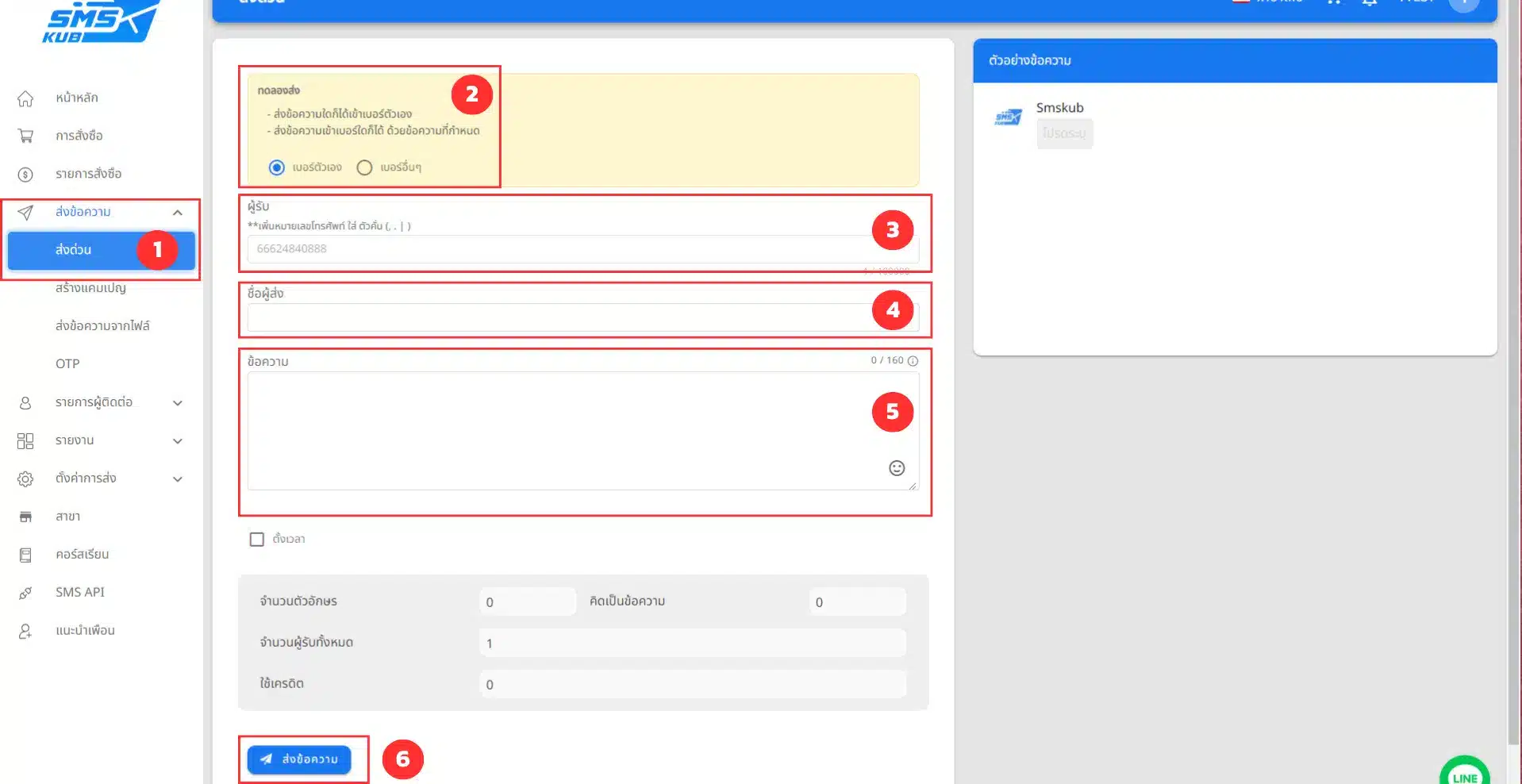 - กรอกเบอร์ปลายทางที่ต้องการทดลองส่ง กรณีเลือกเบอร์อื่นๆ