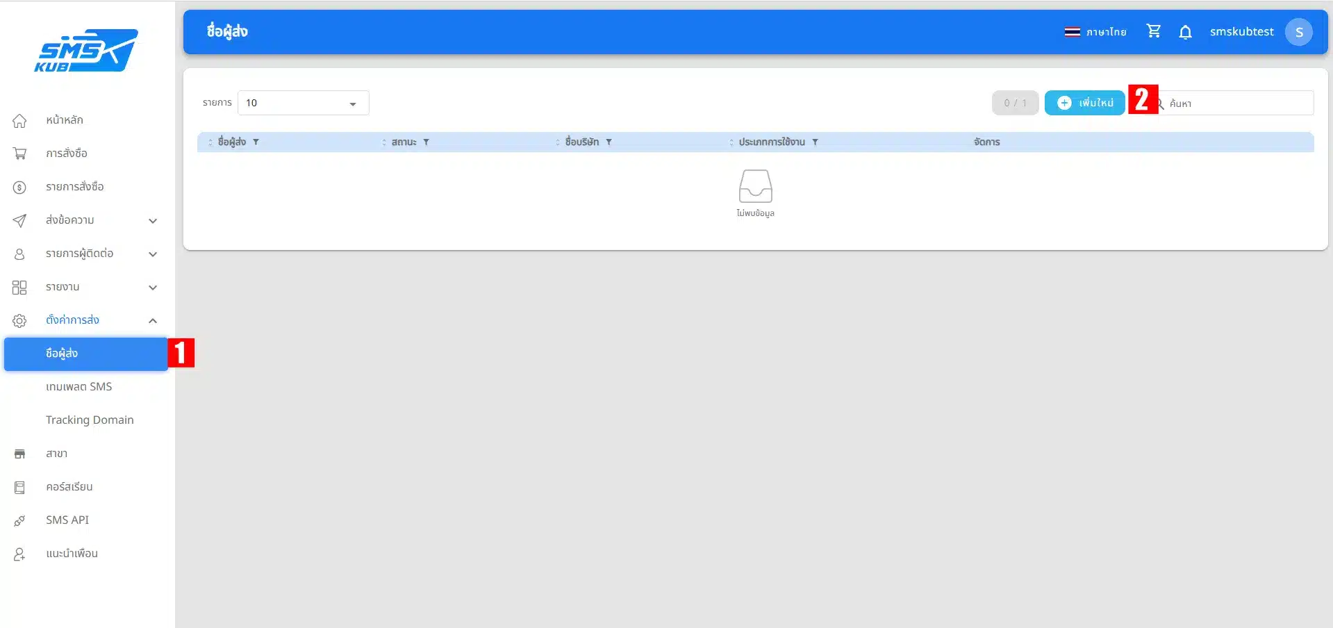 - คลิก เมนูตั้งค่าการส่ง >> ชื่อผู้ส่ง >> คลิก เพิ่มใหม่