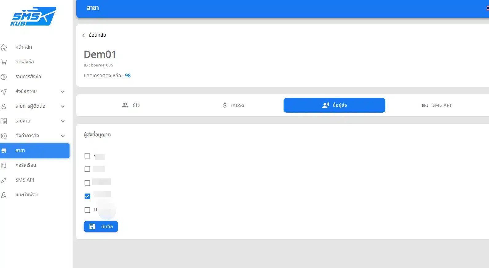 2. คลิกที่เมนู ชื่อผู้ส่ง เลือกชื่อผู้ส่งในระบบที่ต้องการให้สาขาย่อยใช้